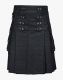 Womens Modern Black Denim Kilt is a distinctive Scottish garment that is designed to cater to current fashion needs. It is fashionable and gives you a charming look to make a unique statement at any event. We offer it in various colours, so you can pick your favourite colour that suits your personality. Modern Black Denim Kilt comes with a detachable plain apron attached with four button straps on both sides. These straps are attached with rectangular rings for a stylish appearance. A lobster clasp is hanging on either side of a kilt for attaching lightweight items. It has flapped pockets on both sides that allow you to carry your everyday essentials like Cell phones, Keys and many others. It features a pleated pattern on the back that resembles the Highlander style and also helps with easy movement. Womens Black Denim Kilt is crafted with top-quality denim material, which ensures its durability. It is available in various sizes at an excellent price. You can wear it at Formal gatherings, Casual parties, and Scottish Weddings. Order now to add a unique Scottish flair to your dressing.