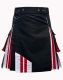 Black Hybrid Utility Kilt in Red & White Straps Pleats is a cool and bold outfit choice for anyone who wants to stand out. It features red and white pleats on the sides and back, inspired by the American flag. The front features a clean black design with red and white straps stitched onto one corner, adding a strong and stylish touch.