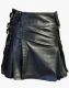 Black Leather Kilt with Pockets and Fastening Straps is a fashionable agreement that adds a royal touch and unique design to your outfits. It is modern and comes with functional elements that meet everyone's contemporary needs. We offer it in various colours so that you can pair it with any of your desired attire. Black Leather Kilt features a flat apron that falls perfectly downwards. It has fastening straps on the waistline area, providing a perfect and comfortable fit for the wearers. These straps are adjustable and made of quality leather with rust-free buckles. D-rings are also connected, allowing you to hang lightweight items like keys and chains. Flap pockets are styled on either side of a kilt, providing enough storage for your everyday essentials like a Cell phone, Wallet, and Keys. It has a pleated rear that shows your attachment to the Highland culture and also helps with easy movement. A button flap is also made on the middle back, making it a more modern and unique piece of Scottish attire. Black Leather Utility Kilt is fabricated with pure leather material, ensuring its comfort and longevity. It is available in various sizes at an affordable price. You can wear it on casual outings, formal and family gatherings, and parties. Order now to get a kilt on your doorstep with handmade features and quality material.