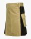 Khaki And Black Hybrid Kilt With Khaki Thread is specially sewn for those who get a two-tone colour kilt in their collection and look unique at their events. This kilt has a khaki front apron with a snap button on the front waist for fastening the kilt. In contrast, black pleated panels are designed traditionally, providing freedom of movement on various occasions. Cargo pockets are sewn on both sides, providing enough space to store your belongings and small items. Khaki And Black Hybrid Kilt also has belt loop features on the waist area for holding and wearing a belt comfortably and making the waist accurately fit. Its unique design and colour contrast make it a versatile addition to your kilt collection.