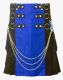Scottish Black and Blue Gothic Kilt with hardware accents on its front gives you a fashionable appearance. It is suitable for showing off your Scottish pride anywhere. It comes with various features making it the perfect choice for stylish men. It has a detachable front apron in Blue that stands out brightly against its Black pleated pattern. It has three straps on each side of the apron decorated with button closures. Each strap is connected with an O-ring for functionality. Chains with lobster clasps adorned on both sides of the front apron. Both pockets of the Black and Blue Gothic Kilt have a unique style. One is entirely black, while the other has a blue flap. These pockets allow you to store your items safely inside.