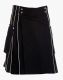 Scottish Black Utility Kilt with Detachable Pockets is designed for those people who get some modernity and style in their kilt and look unique at different events. It is attractive due to its fabric colour combination and perfect for those who want to show off their personality in a crowd or family gathering. This kilt comes with an attractive and unique design of white piping on the pleats' outer corner, giving the kilt an eye-catching look. It has a decent plain front apron with a snap button on the top front waist for kilt fastening. At the same time, the pleated design provides freedom of movement on all occasions. Belt loops are designed on the side and back of the waist to wear a belt and make the kilt a perfect fit. Black Utility Kilt with White Piping has utility features of detachable pockets on both sides for storing hand-hold essentials. If you want to wear a unique kilt for favourite and expensive events, then this kilt is for you. In our online store, you can get this versatile kilt at a fair-minded price. So don't be late get your order now for this custom-made kilt at your door-place.